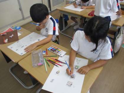 図画工作科では、「まどをひらいて」の作品づくりを進めています。先日、画用紙でつくった家の窓をカッターで切りました。今日は、窓を開くと、その中はどんな世界が広がっているのか想像を膨らませ、窓の中の様子を描きました。「1階はおかしをいっぱいにしよう」「この部屋はリビングにしよう」などと、楽しい世界が広がっていました。完成が楽しみですね。