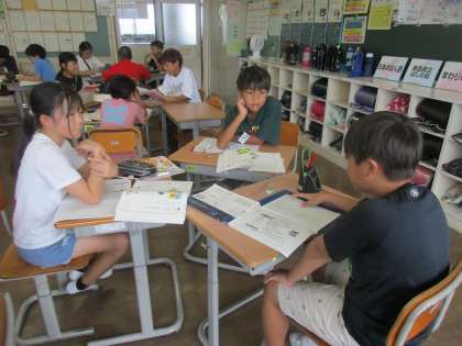 「家族旅行に行くならば、山か。海か」をテーマにして、グループで話し合っています。