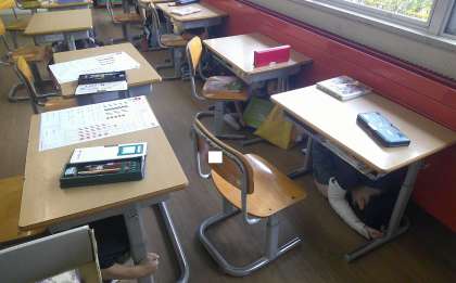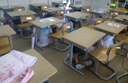 シェイクアウト訓練に参加しました。地震への対応の仕方を身に付け、防災への意識を高めることがねらいです。「まず低く、頭を守り、動かない」という3つの行動をしっかりととることができました。
