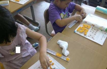 算数科「10よりおおきいかず」で、どのようにドングリの数を求めたらよいかを学習しました。印を付けながら数えたり、10のまとまりを囲んだり、ブロックを使ったりしながら考えました。