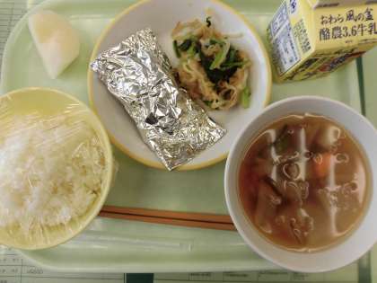 9月5日(木) 今日の給食 公開日 2024/09/05 更新日 2024/09/05 今日の給食 今日の献立は、ごはん、鯖の銀紙焼き、はりはり和え、冬瓜スープ、梨、牛乳です。 冬瓜スープは、冬瓜がやわらかく、にんじんやしいたけ、玉ねぎも入っています。しょうが風味がアクセントになっています。 銀紙焼きのお味噌がごはんにもよく合います。今日はデザートに梨がついています。 今日もおいしくいただきました!
