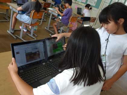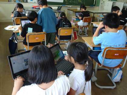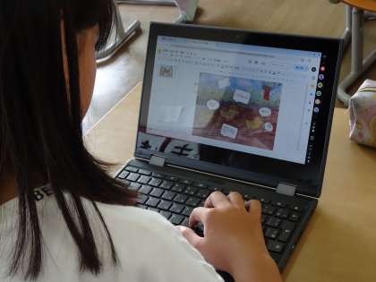 4年生 鑑賞のスライドづくり 公開日 2024/09/05 更新日 2024/09/05 4年生 1学期に描いた絵の鑑賞をクロムブックのスライドを使って行いました。1枚目は、自分の絵、2枚目以降は友達の絵で作りました。がんばったことや工夫したこと等を矢印や囲み、吹き出しを使って効果的に表現しようと考えていました。 「どうすればいいの?」「これはね…」など、互いに聴き合い、教え合う姿が多くみられました。