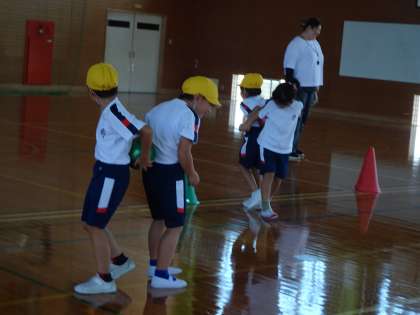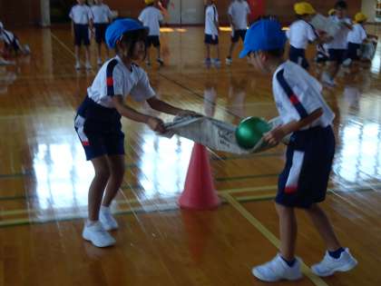 前回の経験を生かし、ボールを上から下から送る運動がスムーズにできるようになりました。新聞紙にボールをのせて2人で運ぶ運動も、持ち方や速さを合わせながらできました。