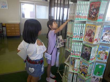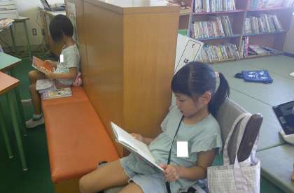 1年1組は、1週間に1回、図書室で本を借りています。興味をもった本を2冊借りると、早速じっくりと読んでいる姿がみられました。