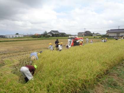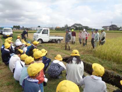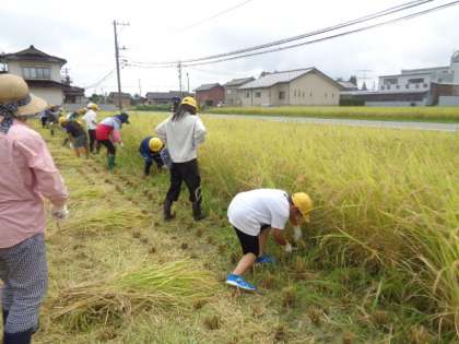 老人会の方々のご指導を受けながら、稲刈りを行いました。稲穂の根元を手で持って鎌で刈り取るのは重労働です。5月に苗を植えてから、稲が成長する過程を観察してきました。金色の穂が田んぼ一面に実っているのを見て、自然の恵みを感じることができた体験でした。