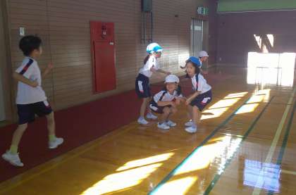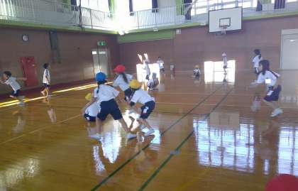 体育の時間の最後に、約5分間、鬼ごっこをしています。今日は、電子レンジ鬼をしました。タッチされた人は凍っているので、その人を囲むように二人で手をつないで「チン!」と解凍すると、また逃げることができるというルールです。二人でタイミングを合わせるのは難しいのですが、子供たちは協力しながら楽しく活動していました。