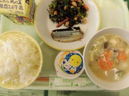 9月12日(木) 今日の給食 公開日 2024/09/12 更新日 2024/09/12 今日の給食 今日は、お月見献立です。 ごはん、さんまの生姜味、大豆とひじきのごま和え、団子汁、お月見ゼリーです。 お月見ゼリーには、うさぎがかたどられています。冷たくておいしいです。 ごちそうさまでした!