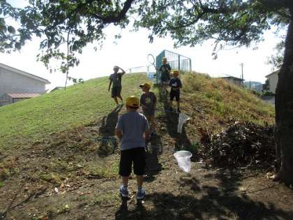 理科の学習「こん虫のすみかをさがそう」では、グラウンドの周辺で虫探しをしました。6時間目は、まだまだ暑く、汗をかきながらの活動でしたが、バッタやトンボを見付け、素早く捕まえるのが楽しそうでした。