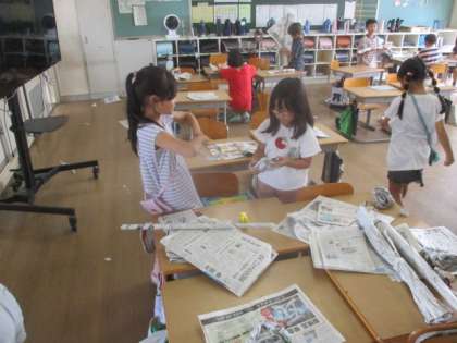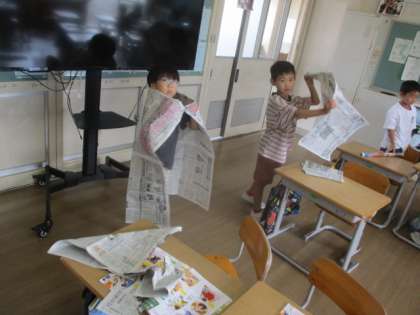 【2年生】しんぶんしとなかよし 公開日 2024/09/13 更新日 2024/09/13 2年生 図画工作科の時間に、新聞紙を使った造形遊びをしました。子供たちは、「ぐしゃぐしゃ」「ひらひら」等の言葉をキーワードに、新聞紙をいろいろな形に変身させていました。