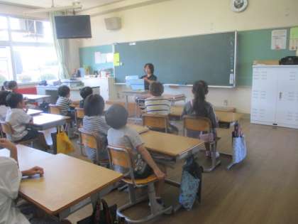 【2年生】読み聞かせ 公開日 2024/09/13 更新日 2024/09/13 2年生 朝の読み聞かせでは、読書ボランティアの方に紙芝居を読んでいただきました。 天狗が登場するお話に引き込まれ、集中してお話を聞いていました。