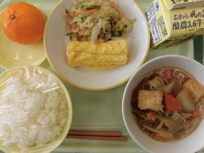 9月17日(火) 今日の給食 公開日 2024/09/17 更新日 2024/09/17 今日の給食 今日の献立は、ごはん、たまごロール、バンサンスー、厚揚げの中華煮込み、冷凍みかん、牛乳です。 厚揚げの中華煮込みは、中華風味の出汁が厚揚げにしみこんでいました。ごはんにもよく合いました。今日は、デザートに冷凍みかんがついています。今日も暑いので、子供たちは大喜びでした! 今日もおいしくいただきました!