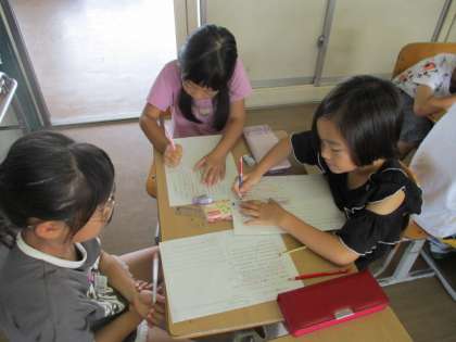 【2年生】文章から考えよう 公開日 2024/09/17 更新日 2024/09/17 2年生 国語科では、「どうぶつ園のじゅうい」の学習を進めています。文章中から獣医さんの仕事や工夫を見付け、ワークシートにまとめました。友達と一緒に「この部分じゃない?」「あっ、ここにも書いてあるよ!」と相談しながら学習に取り組んでいました。