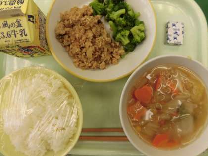 9月19日(木) 今日の給食 公開日 2024/09/19 更新日 2024/09/19 今日の給食 今日の献立は、ごはん、富山のえごま入りガパオライス、ゆでブロッコリー、コーンスープ、ポケットチーズ、牛乳です。 ガパオライスは、ごはんにのせて食べました。オイスターソース等の味付けがちょうどよく、ごはんによく合います。コーンスープには、型抜きされたニンジンがたくさん入っていて見た目も楽しく食べることができました。 今日もおいしくいただきました!