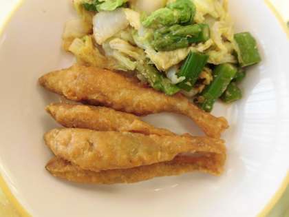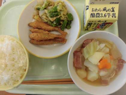 9月24日(火) 今日の給食 公開日 2024/09/24 更新日 2024/09/24 今日の給食 今日の献立は、ごはん、わかさぎのフリッター、グリーンアスパラのごまだれ、野菜のスープ煮、牛乳です。 わかさぎのフリッターは、カリッと揚がっていました。スープ煮の野菜はしっかり煮込まれていてやわらかく食べやすくなっていました。今日もおいしくいただきました!