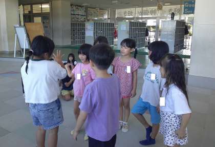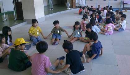 最初は一人が隣の子に「こんにちは」と言います。挨拶された子は、「こんにちは」と挨拶を返します。そして、次の隣の子に挨拶をして、最初の子に挨拶が返るまで続けました。
