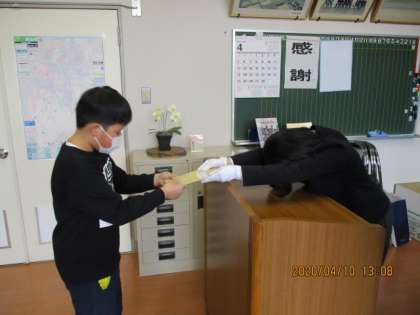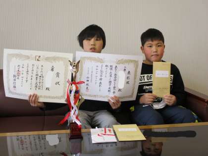 4月10日(金)児童2名が、「ふちゅう曲水の宴」に応募した短歌が入賞し、校長先生から賞状等を受け取りました。短歌の課題は「絆」です。地域のイベントに参加し、授賞できたことをうれしく思います。