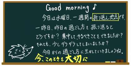 【5年生】折り返し地点 公開日 2020/05/13 更新日 2020/05/13 5年生 おはようございます。今日は1週間の折り返し地点です。昨日までの過ごし方を振り返ってみると、どうですか?集中できたとバッチリな人も、少しダラダラしたかなと反省する人もいるかもしれませんね。学校が始まったときのことを考えると、今のうちから学習する習慣をつけておくことは大切だと思います。まずは今日、そして明日明後日と、時間を大切にして過ごしてみましょう。
