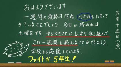 【5年生】5月15日 朝 公開日 2020/05/15 更新日 2020/05/15 5年生 おはようございます。図工の下描きがはやく終わったら、「声に出して読んでみよう」や「パプリカ」に挑戦したり、読書や自学、運動に取り組んだり、少しつかれた人はのんびりしたりと、有意義に過ごしてくださいね。