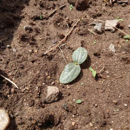 休校中にヘチマを植えました。理科の勉強で観察する予定です。本当はみんなと植えたかったのですが、残念です。1ヶ月ほどで、芽が出てきました。学校が再開したときに、みんなで観察しに行きましょう。