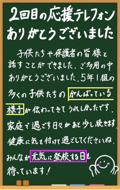 【5年生】5月19日 夕方 公開日 2020/05/19 更新日 2020/05/19 5年生 こちらは応援する側でしたが、むしろ私が背中を押してもらえたように感じ、元気をもらえました。保護者の皆様、5年1組のみなさん、ありがとうございました。