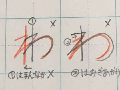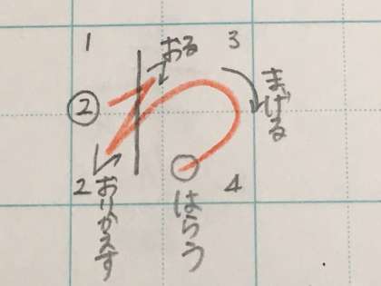 【1年生】ひらがな「わ」 公開日 2020/05/21 更新日 2020/05/21 1年生 「わ」の かきかたを べんきょう しましょう。 1 たてのかべより ひだり、 1のへやから 2のへやまで たてに せんを ひく。 2 1のへやの したがわから みぎあがりに みじかく よこせんを ひき 2のへやまで ひだりさがりに さがり みぎあがりに 3のへやまで あがり まるく まがり、4のへやで はらう。 2かくめが むずかしい ですね!