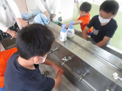 【3年生】ウォッシュタイム 公開日 2020/05/26 更新日 2020/05/26 3年生 コロナウイルス感染予防のため、ウォッシュタイムを登校後、なかよしタイム後、給食前に設定し、取り組んでいます。曲を聴きながら、20〜30秒丁寧に手を洗っている姿が見られました。