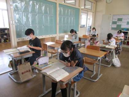 分散登校の2日目、学習に取り組む中で、しっかりと話を聞くことを意識している子供が多かったです。そして、写真は、漢字辞典を使って学習している様子です。真剣に、そして、集中して取り組んでいました。6月1日からは全員が登校してきます。今日のように、話を集中してきく姿勢を大切にしてください。