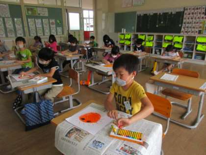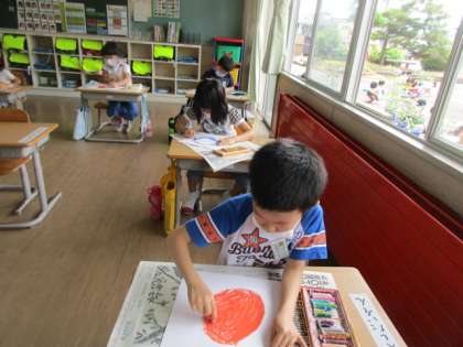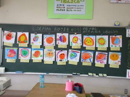 【1年生】初めての図工 公開日 2020/06/01 更新日 2020/06/01 1年生 今日からいよいよみんな揃っての学校生活が再開です。1年生の図工では、「自分だけのおひさま」を描きました。 「やさしいおひさま」「あついおひさま」「すずしいおひさま」「やきゅうがすきなおひさま」「つよいおひさま」「うたっているおひさま」等々、想像を広げて、それぞれが自分だけのおひさまを描き上げました。
