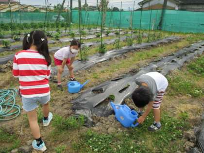 1、2年生で植えたさつまいもの苗の水やりが始まりました。重いじょうろを持って、ひとつひとつの苗に丁寧に水をやっている姿が見られ嬉しく思います。
