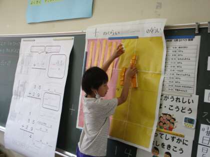 ブロックを用いて、一のくらいの部屋に10以上の数が集まったら十のくらいへ引っ越しをすることを子供たちは発表しました。