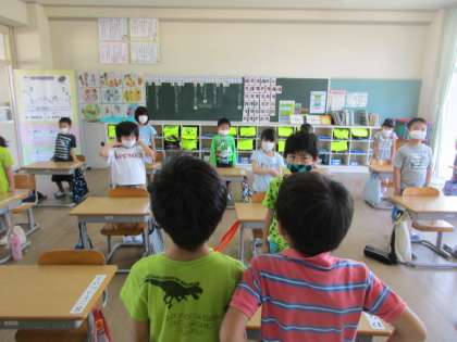 一生懸命な日直さんと一生懸命に聞く子供たち。よくがんばっていて立派です。