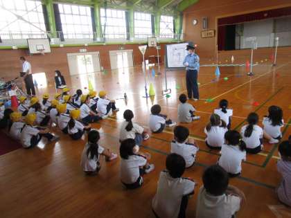 講義では、自転車の正しい乗り方について学びました。自転車は車の仲間であることや標識や信号の示す意味、横断歩道の渡り方など、子供たちにとって初めて知ったことがあり、驚きながら真剣に話を聞いていました。