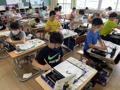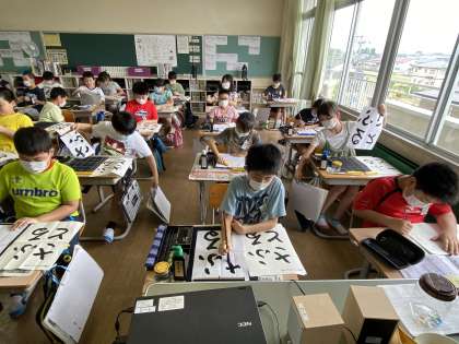 【5年生】一筆一筆丁寧に 公開日 2020/06/05 更新日 2020/06/05 5年生 書写の学習では習字に取り組みました。今日は「ふるさと」を書きました。点画のつながりを意識して書く姿がよかったです。