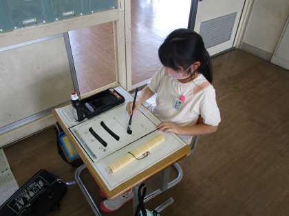 【3年生】毛筆の学習 公開日 2020/06/09 更新日 2020/06/09 3年生 毛筆の学習では、横画に気を付けて「二」を書きました。トン・スー・トンというリズムに合わせてお手本に近づくようにと書く姿が見られました。