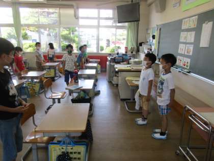 【1年生】朝の会 公開日 2020/06/09 更新日 2020/06/09 1年生 今日も1年生は全員出席で、元気いっぱいです。 朝の会では、健康観察と一緒に「はてなぼう(ハンカチ、ティッシュ、名札、安全帽子)チェック」も行っています。