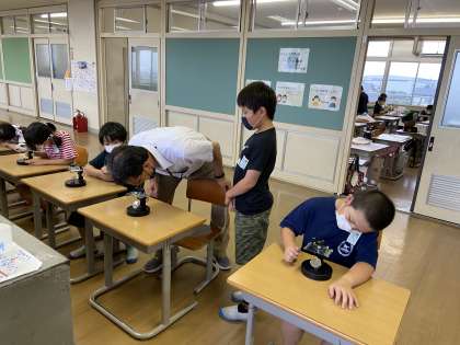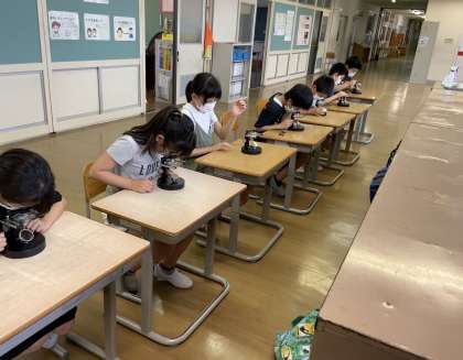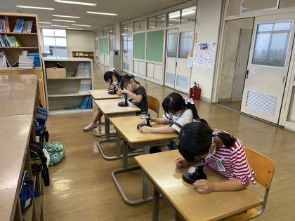 理科担当の先生に準備していただき、顕微鏡を使ってメダカの卵を観察しました。今まで教科書で見ていたものの、本物を見たことはなかった子供たち。見たときには「目があった」「すごい!」等、感動した様子でした。