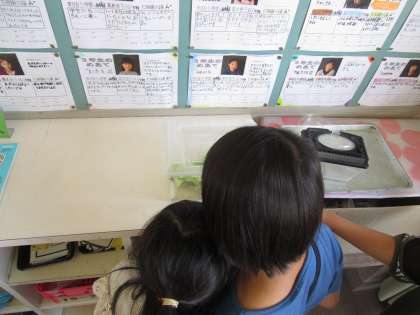 教室で育てていたモンシロチョウが大きくなってきています。実物の幼虫に子供たちは「こんなに小さいんだ」「ふんがいっぱいある」など楽しそうに話していました。