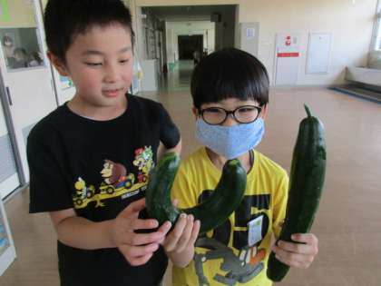 びっくりするくらい大きなキュウリです。とても嬉しそうでした。おうちで美味しく食べてくださいね!