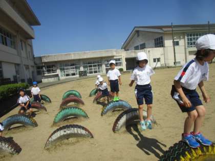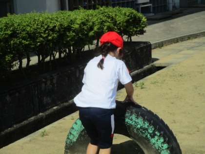 体育の時間にジャングルジムやタイヤを使ってたくさん体を動かしました。まずは、タイヤに登ったり、降りたりをしました。続いて、タイヤを使って跳び箱のように手をついて跳び越えました。最後に、ジャングルジムに登り足だけを外す、ぶら下がるという技を挑戦しました。子供たちは楽しそうに授業に参加していました。