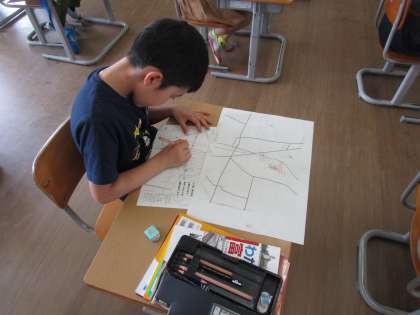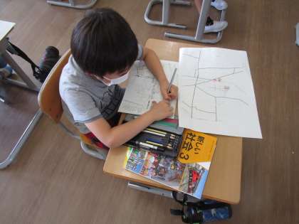 社会科「わたしたちのまち」の学習では、神保小学校の周りがどのようになっているかを予想し、地図に書き込みました。明日は、この地図をもって町探検へ行きます。実際にどうなっているのかを確認しましょう。