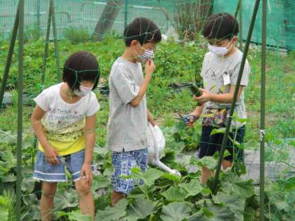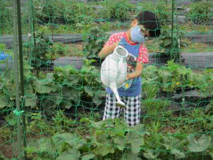 自分たちの野菜だから、自分たちで育てる。 責任持って水やりをしたり、葉や実の様子を確かめたりしています。