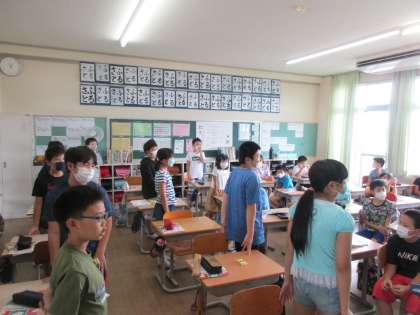 外国語科の学習では、Unit 1「Hello,friends.」の学習を終えました。8時間の単元を通して、子供たちは大きく成長したように感じます。子供たちの振り返りとして、「名前のつづりを尋ねる言い方を言えるようになった」「好きなものを尋ねることができるようになった」「少し難しいところもあったけれど、チャレンジしてできるようになった」等の記載があり、達成感を味わっていました。