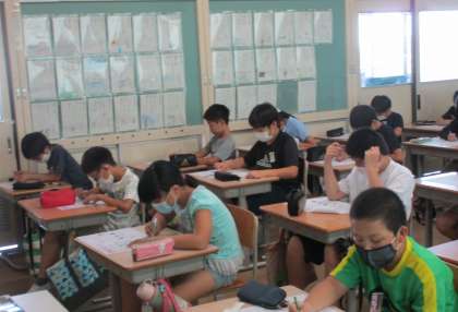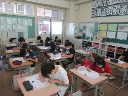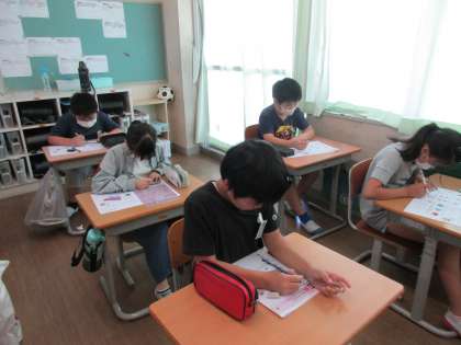 外国語科のテストを初めて実施しました。CDの指示や音声をよく聞き、精一杯解答していました。
