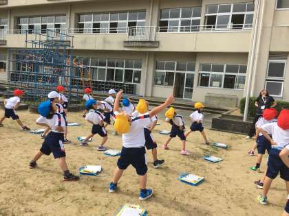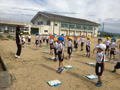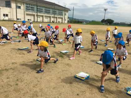今日も梅雨の晴れ間、きれいな青空の下、元気よく準備体操をして体育が始まりました。体操の仕上げにジャンプをするのですが、子供たちはいつもこのジャンプで笑顔になります。リズムに合わせてグーパーするのが楽しいようです。可愛いです。
