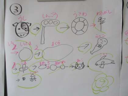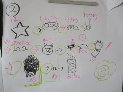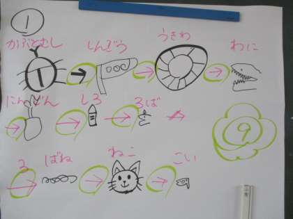 これは最初に担任が出したお題から、子供たちが実際にしりとりをしてつなげて描いた絵です。誰がどれを描いたか分かるでしょうか?