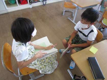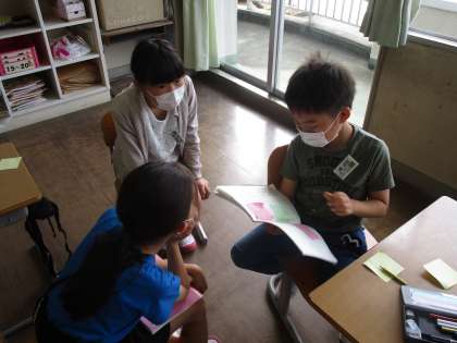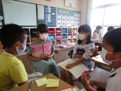 国語科「もっと知りたい、友だちのこと」の学習では、3回目のグループ活動を行いました。3回繰り返す中で、質問をする回数が増えたり、聞く姿勢を気を付けられるようになったり、前回よりもはっきりと伝えたりすることができたと子供自身が感じることができたようです。聞く態度や相手に伝えることは、どの学習でも大切になってきます。この学習で身に付きつつあることをこれからも気を付けていってほしいと思います。