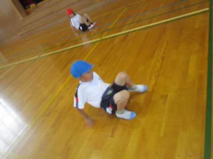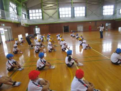 今日は朝から雨が降っていたため、1年生は初めて体育館で体育の授業を受けました。授業では、くも走り、後ろ走りなどいろいろな走り方に挑戦しました。いつもとは違う走り方に子供たちは悪戦苦闘していましたが、楽しそうに参加していました。