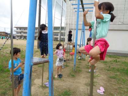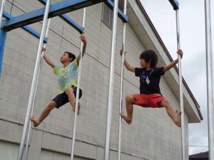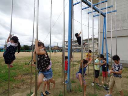 登り棒で遊びました。体育で学習した2本を使って登る技や、隣の棒にわたる技で楽しく体を動かしました。