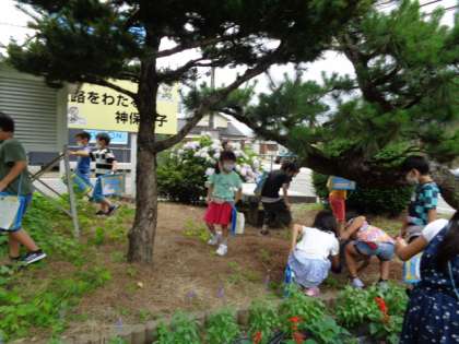 探検中にツバメの巣を2つ見つけました。雛が口を開けて親鳥にえさをもらっているところも見つけ、「可愛い!」と大喜びの子供たち。羽黒トンボやオニヤンマも見つけました。