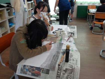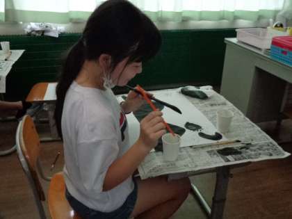 墨絵を描く子供たち。墨の濃淡や筆の太さ等を楽しみながら作品を作っていました。